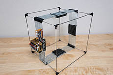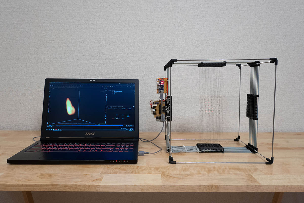 My final 3D display consists 512 SMD chip LEDs(Red), circa 0.1mm copper wire, 8 LED drivers, steel rods, 3D-printed parts and a Arduino controller to interface PC. One LED grid module consists 64 LEDs laid in 8 x 8 grid, controlled by a LED driver MAX7219. Whole display system is essentially a stack of this grid module. To achieve minimum visibility of LEDs, I have chosen a LED chip with wide visible angle (170 deg). 8 modules are stacked together to make a cube with 8 bit resolution per axis. All modules are daisy chained to Arduino controller over SPI interface.