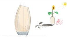 To induce user to put a sunflower to the specific direction, the mouth of the vase is slightly tilted towards one side. Electronic components are stored in the bottom, rotates the vase according to the sun position. Light sensors are attached on the vase surface to manifest it's functional capability.