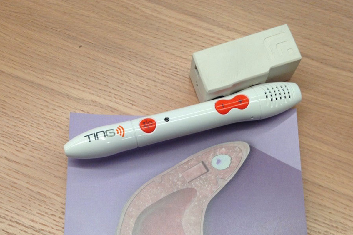The TING™ audio-pen is an OiD (optical identification code) reader and sound player for education. The pen is used for interactive picture books for children,